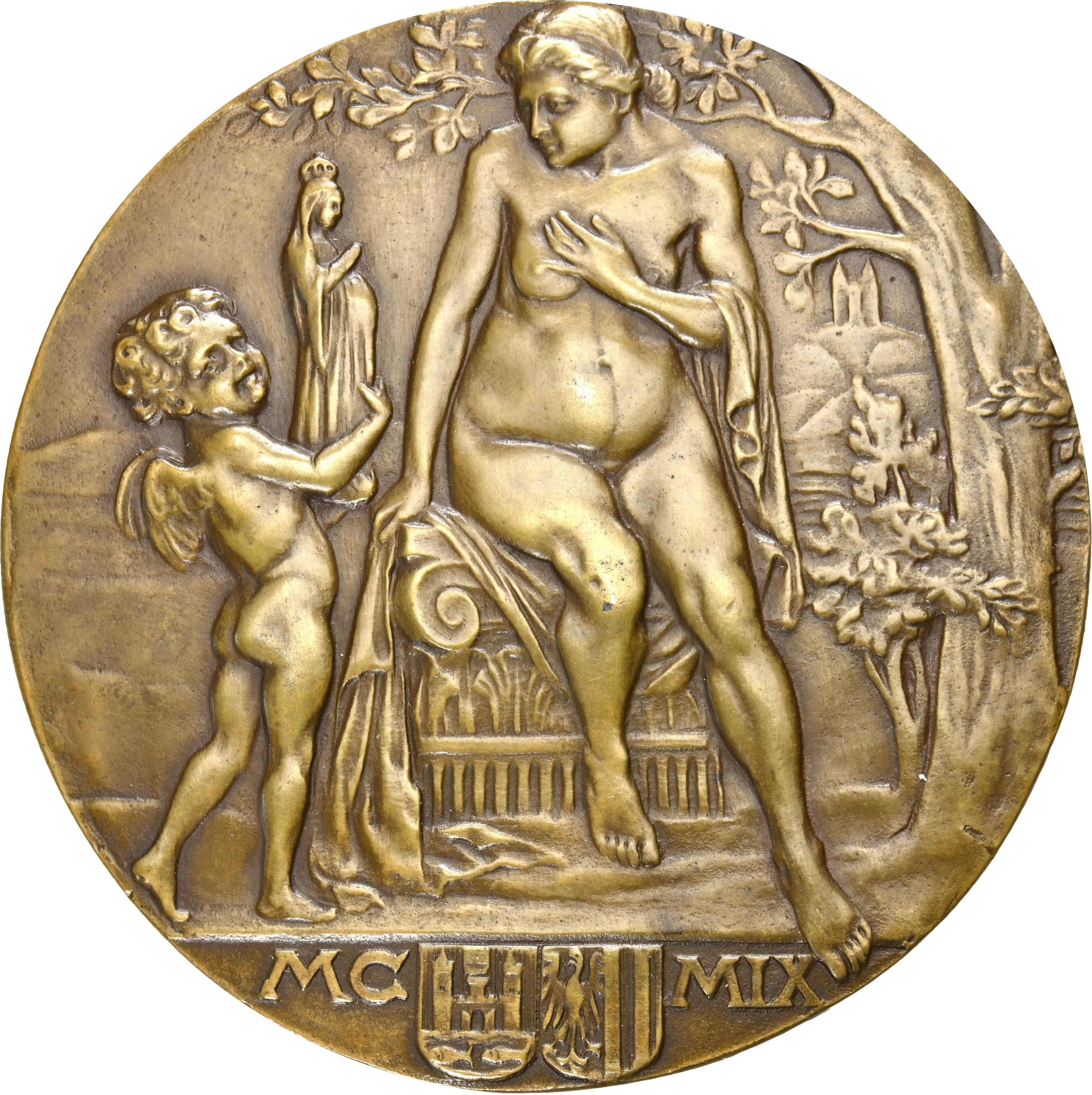 Описание: Гола вагітна жінка сидить під листяним деревом на передньому плані на коринфській колоні і тримає ліву руку на правій груді; справа до неї підлітає крилатий путто і показує їй статуетку вагітної Марії; на задньому плані на горі — церква з двома вежами. Нижче — герб Лінца та Верхньої Австрії.