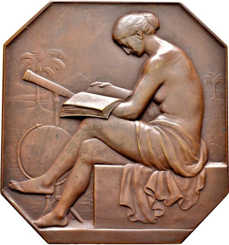 Описание: Напівгола жінка, вкрита лише тканиною, сидить на кубі з книгою ліворуч, перед глобусом і телескопом, а на задньому плані — пейзаж з пальмами.