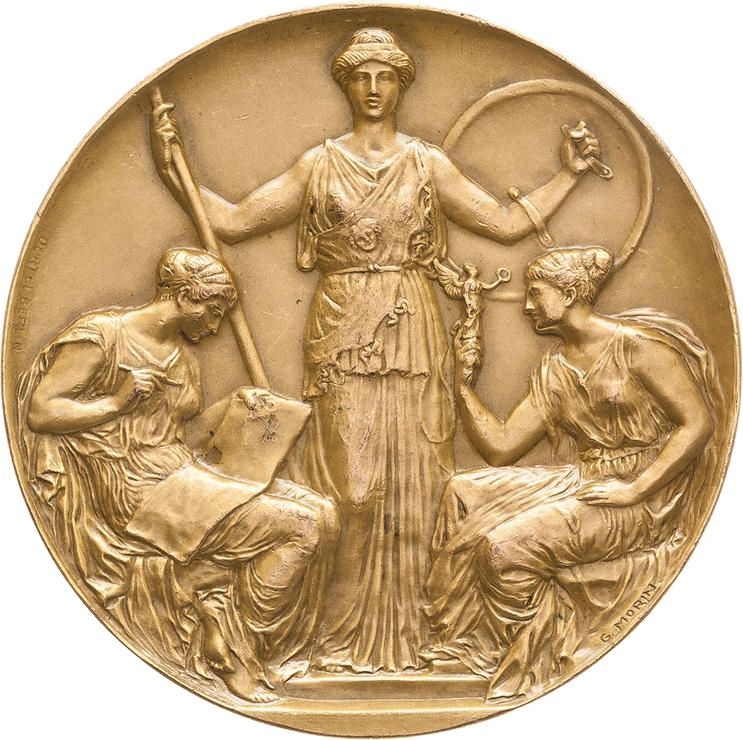Описание: Палада Афіна зі щитом і списом спереду посередині між двома жіночими фігурами, що сидять одна навпроти одної, одна з пером і документом, інша зі статуеткою Ніки в правій руці. Персоналізація літератури та образотворчого мистецтва.