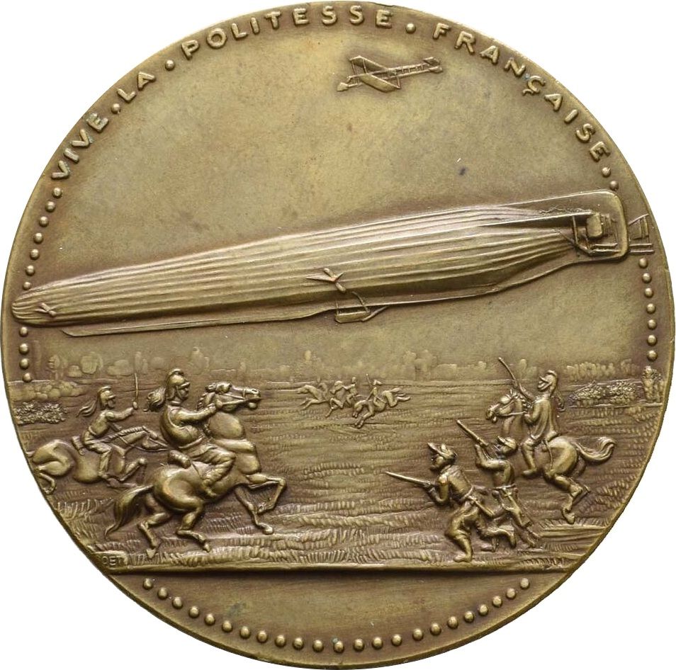 Описание: Повітряний корабель приземляється, переслідуваний біпланом та французькою кавалерією і піхотою.