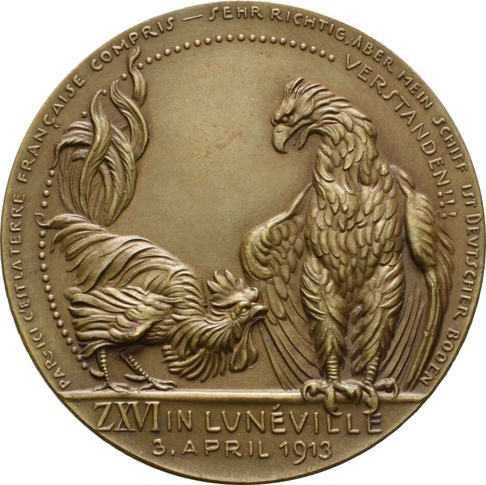 Описание: Галльський півень і німецький орел у суперечці.