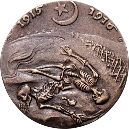 Описание: Два скелети лежать у траншеях, колючий дріт заплутався вдалині (праворуч), над ними півмісяць і зірка.