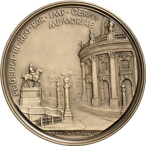 Описание: Вид на музей кайзера Фрідріха (сьогодні музей Боде) з кінною статуєю Фрідріха III, побачений з мосту Монбіжу.