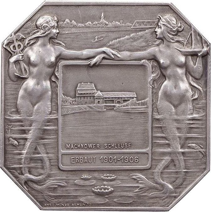 Описание: Дві оголені русалки з атрибутами кадуцей і корабель тиснуть руки над прямокутною панеллю, на якій зображено шлюз Махнов.