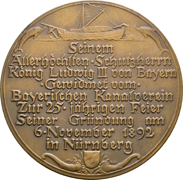 Seinem // Allerhöchsten.Schutzherrn // König Ludwig III von Bayern // .Gewidmet vom. // Bayerischen Kanalverein // zur 25. jährigen Feier // Seiner Gründung am // 6.November 1892 // in Nürnberg