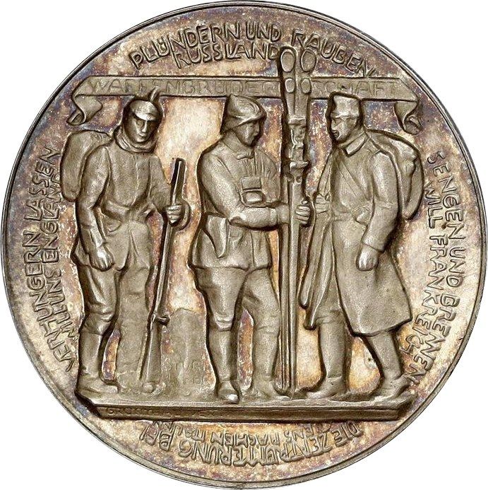 Описание: Бюсти Вільгельма II, Мохаммеда V та Франца Йосифа над зображенням військового наради.