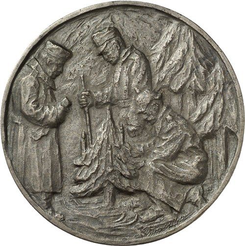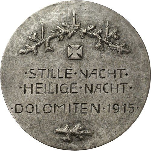 Описание: Під гілками ялинки з палаючими свічками та Залізним хрестом розміщено трирядковий напис, а під ним — ще одна гілка ялинки.