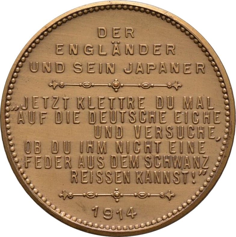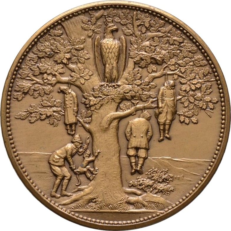 Описание: Англієць відправляє мавпу в японській уніформі на дуб. На дереві вгорі сидить німецький орел, на нижніх гілках — троє повішених чоловіків.