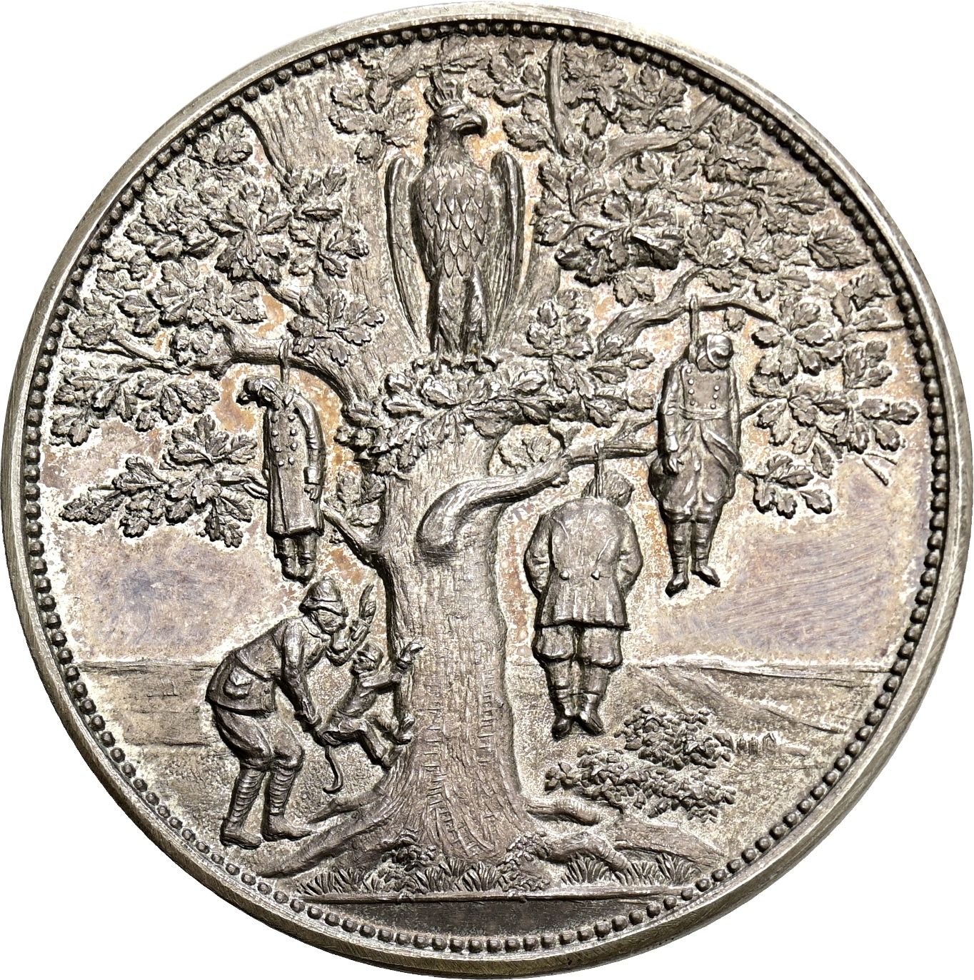 Описание: Англієць відправляє мавпу в японській уніформі на дуб. На дереві вгорі сидить німецький орел, на нижніх гілках висять три повішені чоловіки.