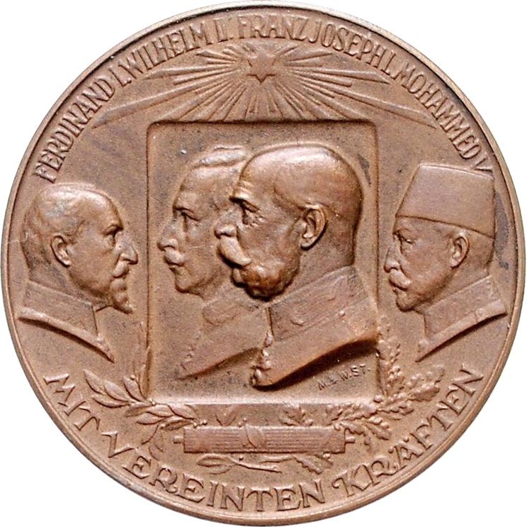 Описание: У центрі — бюсти Вільгельма II та Франца Йосифа, звернені вліво, ліворуч — Фердинанд I, звернений вправо, і праворуч — Мохаммед V, звернений вліво, зверху — промениста зірка, а знизу — фасції з лавровою та дубовою гілкою.
