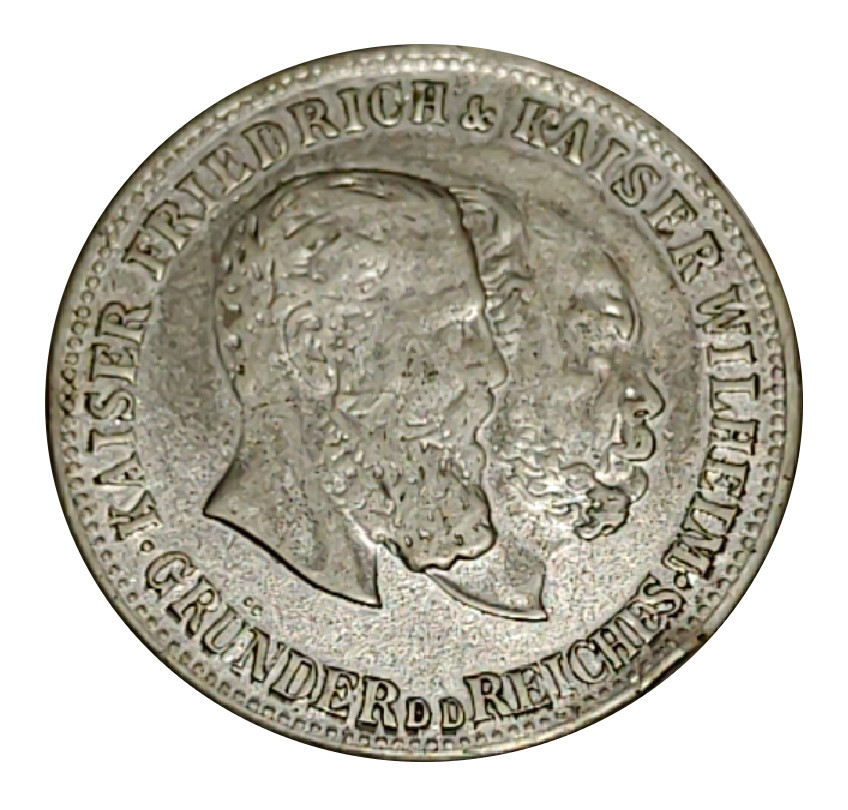 Описание: Два бюсти (праворуч) кайзера Фрідріха (сина) та кайзера Вільгельма (батька) з написом навколо.