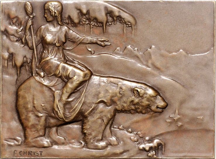 Описание: На зимовому пейзажі зображена жіноча фігура, що сидить на спині полярного ведмедя, повернена вправо, з скіпетром у правій руці.