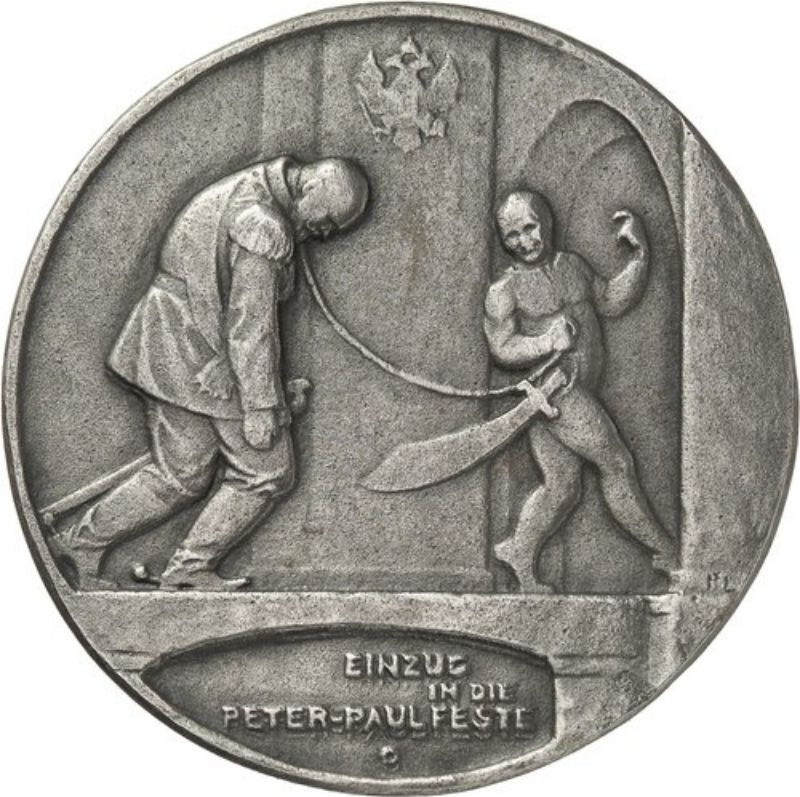 Описание: Оголений чоловік, озброєний кривим мечем, веде до фортеці присілого чоловіка з мечем і зашморгом на шиї. Нижче розміщено трирядковий напис. Зверху на воротах зображено царського орла.