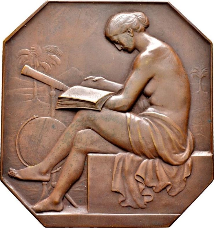 Описание: Жінка, що сидить обличчям вліво, одягнена лише в набедрену пов'язку, тримає відкриту книгу і читає її, біля її ніг лежать глобус і телескоп, на задньому плані — пальми.