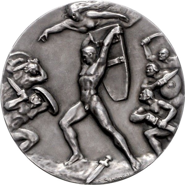Описание: Молодий оголений герой, який використовує щит як зброю, його меч лежить на землі. Уособлення того, що навіть проти ворогів, які виглядають сильнішими у зброї, німецький герой бореться з усією своєю героїчною відвагою. Жіноча фігура зверху як божественна підтримка, що веде до ворогів. Вороги з боків представляють ворогів на заході та сході Німеччини.