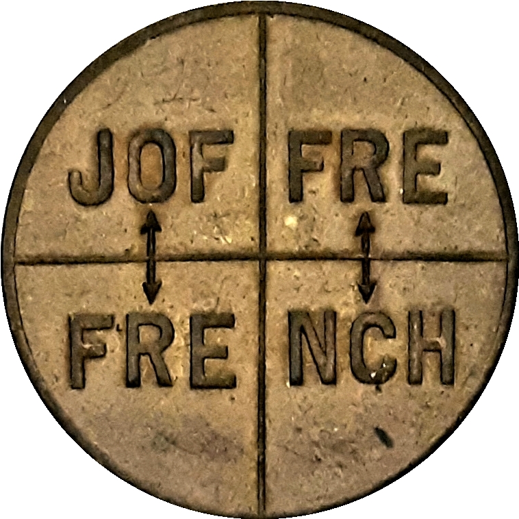 Описание: Лінії під прямим кутом, що ділять монету на чотири частини. 2 двосторонні стрілки між лівою і правою частинами, що показують імена Жоффре і Френч.