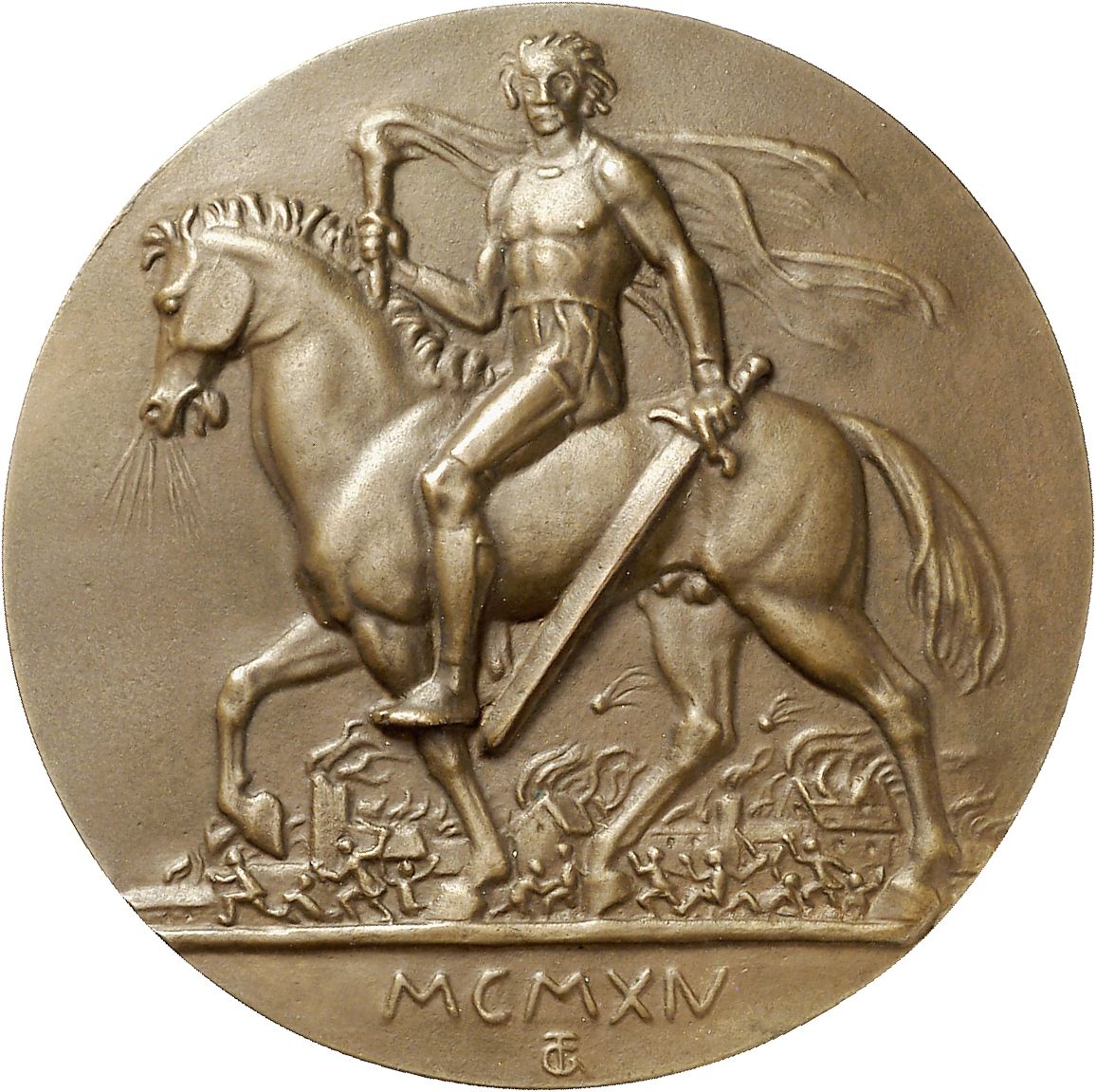 Описание: Вершник з факелом і мечем ліворуч. На задньому плані — палаюче місто і плачучі люди.