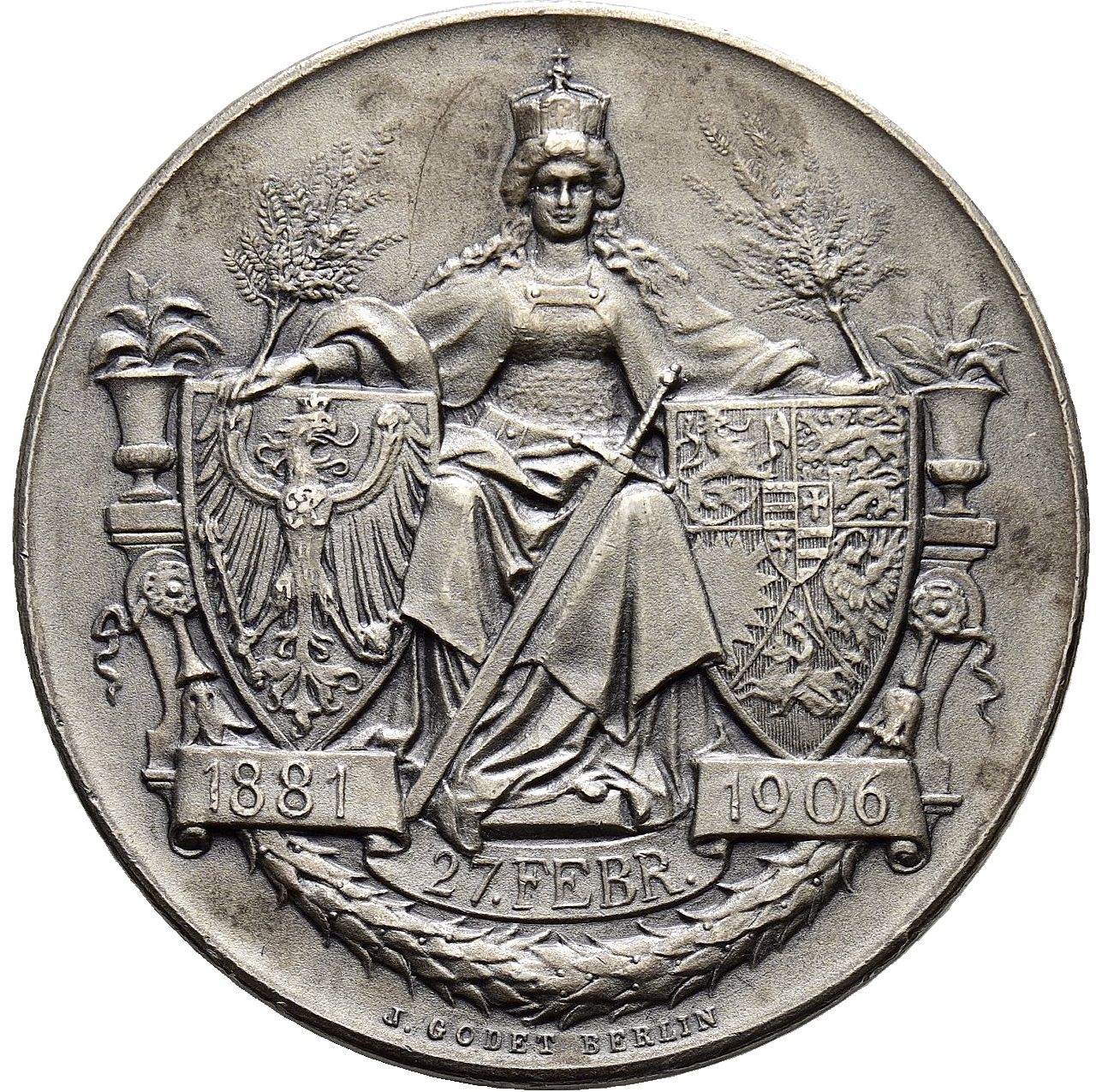 Описание: Коронована жіноча фігура, що сидить на троні між щитами Гогенцоллернів та герцогського дому Шлезвіг-Гольштейн, з мечем між ногами, Боруссія / Германія, її витягнуті руки лежать на щитах, в руках вона тримає гілки, включаючи гірлянду, яка з боку прикріплена до стовпів, що оточують трон, а на стовпах стоять квіткові горщики.