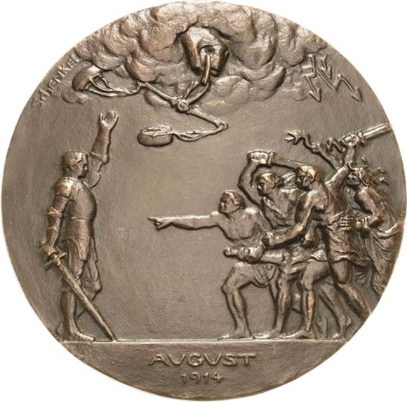 Описание: Праворуч — ворог, озброєний мечами та зміями, ліворуч — уособлення Німеччини у вигляді броньованого лицаря, який тримає меч і простягає ліву руку до неба. Вгорі, серед бурхливих хмар, — рука Бога, яка тримає терези як символ рівності.