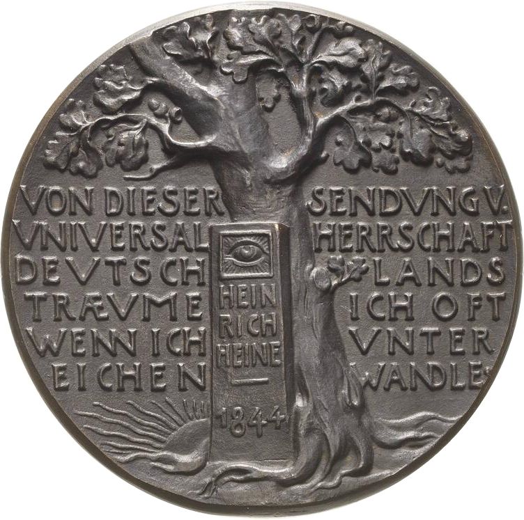 Описание: Меморіальний камінь на честь Генріха Гейне, що стоїть біля дуба, на тлі східного сонця.