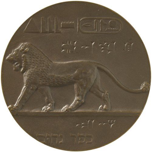 Описание: Лев Східного товариства крокує вліво. Зверху клинопис і картуш з ієрогліфами, знизу напис клинописом і гебрейськими літерами про основні місця діяльності товариства.