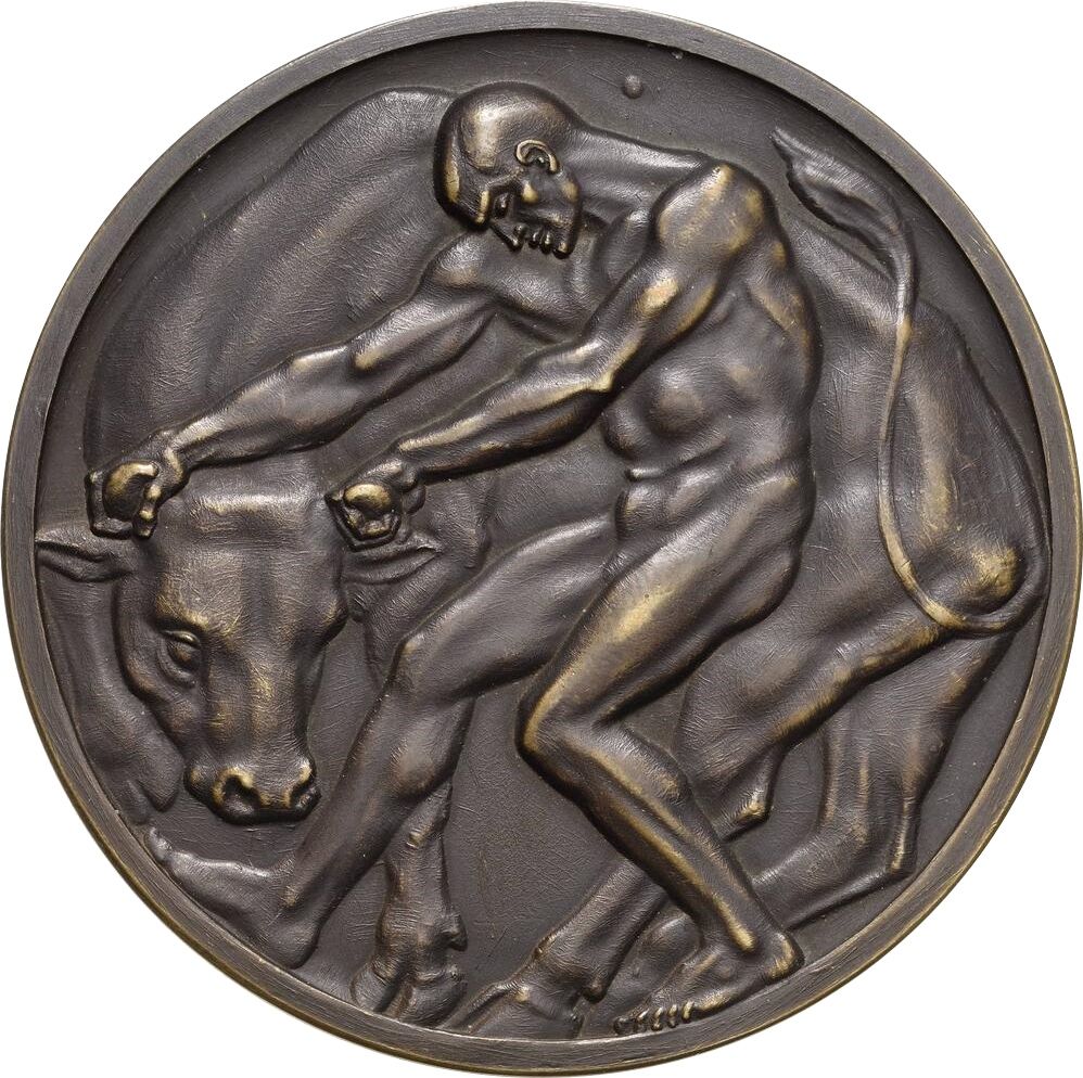 Описание: Голий чоловік, який взяв бика за роги і бореться з ним.