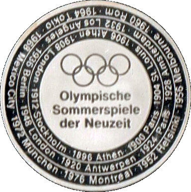 Описание: Внутрішнє коло з п'ятьма олімпійськими кільцями та написом. Три зовнішні кола з написом.