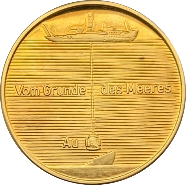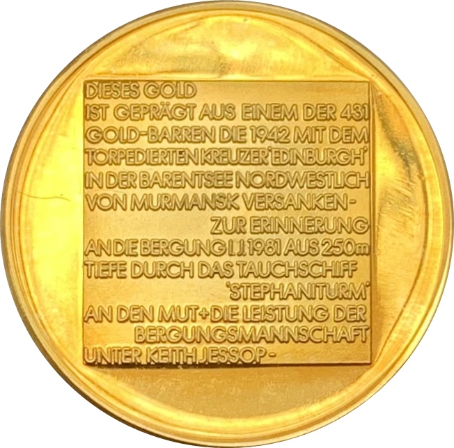 DIESES GOLD // IST GEPRÄGT AUS EINEM DER 431 // GOLD-BARREN DIE 1942 MIT DEM // TORPEDIERTEN KREUZER 'EDINBURGH' // IN DER BARENTSEE NORDWESTLICH // VON MURMANSK VERSANKEN- // ZUR ERINNERUNG // AN DIE BERGUNG 1. J. 1981 AUS 250m // TIEFE DURCH DAS TAUCHSCHIFF // 'STEPHANITURM' // AN DEN MUT+DIE LEISTUNG DER // BERGUNGSMANNSCHAFT // UNTER KEITH JESSOP -
