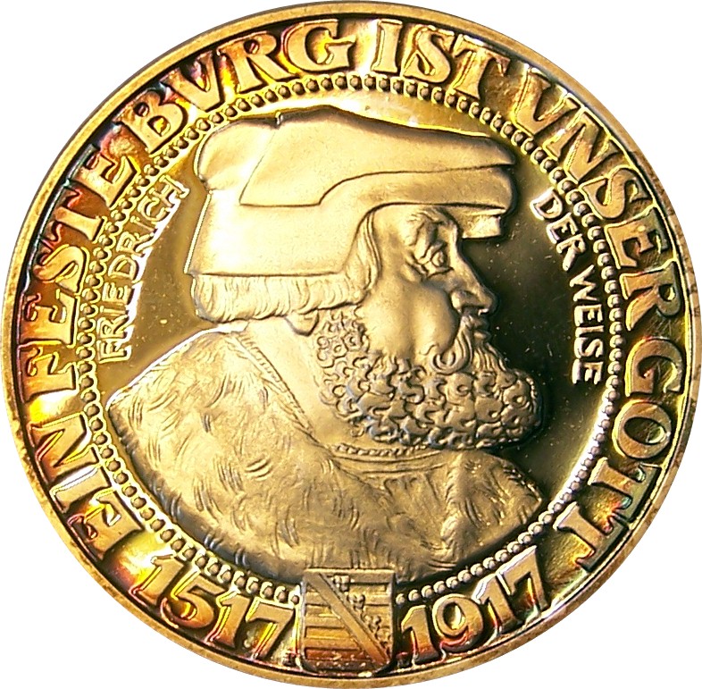 Описание: Бюст Фрідріха Мудрого, що дивиться вправо, за мотивами портрета Лукаса Кранаха. По краю монети розміщений круговий напис, а внизу — саксонський герб.