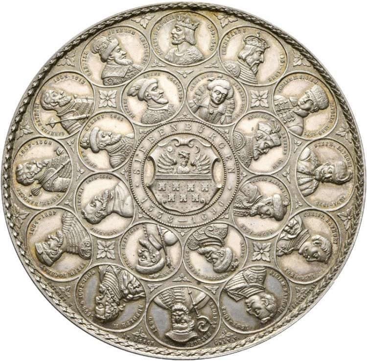 Описание: Герб Трансильвании. 20 портретов князей Трансильвании в круглых медальонах, расположенных в два концентрических круга. Во внутреннем круге, по часовой стрелке: княгиня Екатерина Бранденбургская, обращенная вправо; князь Стефан Бетлен, обращенный вправо, в шляпе с пером; князь Георг I Ракоци, обращенный вправо, в шляпе с пером; князь Георг II Ракоци, обращенный вправо, в шляпе; князь Франциск Редей де Кис-Реде, обращенный вправо, в шляпе и со скипетром; князь Акош Барчай, обращенный вправо; князь Иоанн Кемени, обращенный вправо, в шляпе; и князь Михаил I Апафи, обращенный вправо, в шляпе с пером. Во внешнем круге, по часовой стрелке: король Иоанн Заполья, обращенный влево, в короне; император Фердинанд I, обращенный вправо, в короне; король Иоанн II Сигизмунд Заполья, обращенный влево, в шляпе; воевода Стефан Баторий, обращенный вправо, в шляпе с пером; воевода Кристоф Батёри, обращенный вправо; князь Сигизмунд Батёри, обращенный вправо; князь Андрей Батёри, лицом к зрителю, в шляпе и с пасторалом; император Рудольф II, обращенный вправо, в лавровом венке; князь Стефан Бочкай, обращенный вправо, в шляпе; князь Сигизмунд Ракоци, обращенный вправо, с жезлом; князь Габриэль Батёри, обращенный вправо, с жезлом; и князь Габриэль Бетлен, обращенный вправо, в шляпе с пером.