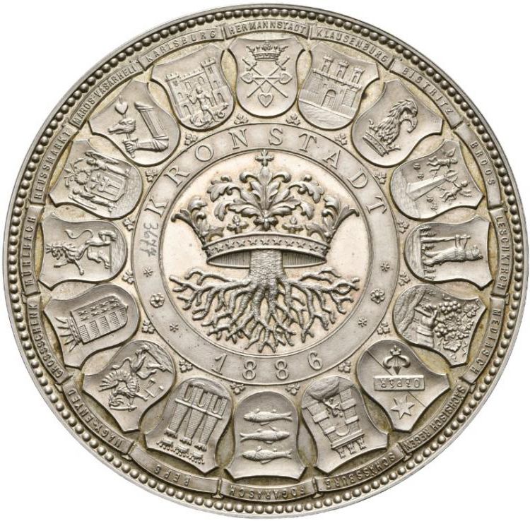 Описание: Герб Кронштадта (современный Брашов, Румыния). 16 гербов, расположенных по кругу вокруг: Германштадт (современный Сибиу, Румыния), Клаузенбург (современный Клуж-Напока, Румыния), Бистриц (современная Бистрица, Румыния), Броос (современная Ораштие, Румыния), Лешкирх (современный Нокрич, Румыния), Медиаш (современный Медиаш, Румыния), Саксих-Реген (современный Регин, Румыния), Шесбург (современная Сигишоара, Румыния), Фогараш (современный Фэгараш, Румыния), Репс (современная Рупеа, Румыния), Надь-Эньед (современный Аюд, Румыния), Гроссшенк (современный Чинку, Румыния), Мюльбах (современный Себеш, Румыния), Ройсмаркт (современный Меркуря-Сибиулуй, Румыния), Марош-Вашархели (современный Тыргу-Муреш, Румыния) и Карлсбург (современная Альба-Юлия, Румыния).