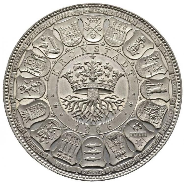 Описание: Герб Кронштадта (современный Брашов, Румыния). 16 гербов, расположенных по кругу вокруг: Германштадт (современный Сибиу, Румыния), Клаузенбург (современный Клуж-Напока, Румыния), Бистриц (современная Бистрица, Румыния), Броос (современная Ораштие, Румыния), Лешкирх (современный Нокрич, Румыния), Медиаш (современный Медиаш, Румыния), Саксих-Реген (современный Регин, Румыния), Шесбург (современная Сигишоара, Румыния), Фогараш (современный Фэгараш, Румыния), Репс (современная Рупеа, Румыния), Надь-Эньед (современный Аюд, Румыния), Гроссшенк (современный Чинку, Румыния), Мюльбах (современный Себеш, Румыния), Ройсмаркт (современный Меркуря-Сибиулуй, Румыния), Марош-Вашархели (современный Тыргу-Муреш, Румыния) и Карлсбург (современная Альба-Юлия, Румыния).