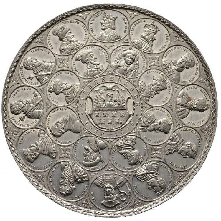 Описание: Герб Трансильвании. 20 портретов князей Трансильвании в круглых медальонах, расположенных в два концентрических круга. Во внутреннем круге, по часовой стрелке: княгиня Екатерина Бранденбургская, обращенная вправо; князь Стефан Бетлен, обращенный вправо, в шляпе с пером; князь Георг I Ракоци, обращенный вправо, в шляпе с пером; князь Георг II Ракоци, обращенный вправо, в шляпе; князь Франциск Редей де Кис-Реде, обращенный вправо, в шляпе и со скипетром; князь Акош Барчай, обращенный вправо; князь Иоанн Кемени, обращенный вправо, в шляпе; и князь Михаил I Апафи, обращенный вправо, в шляпе с пером. Во внешнем круге, по часовой стрелке: король Иоанн Заполья, обращенный влево, в короне; император Фердинанд I, обращенный вправо, в короне; король Иоанн II Сигизмунд Заполья, обращенный влево, в шляпе; воевода Стефан Баторий, обращенный вправо, в шляпе с пером; воевода Кристоф Батёри, обращенный вправо; князь Сигизмунд Батёри, обращенный вправо; князь Андрей Батёри, лицом к зрителю, в шляпе и с пасторалом; император Рудольф II, обращенный вправо, в лавровом венке; князь Стефан Бочкай, обращенный вправо, в шляпе; князь Сигизмунд Ракоци, обращенный вправо, с жезлом; князь Габриэль Батёри, обращенный вправо, с жезлом; и князь Габриэль Бетлен, обращенный вправо, в шляпе с пером.