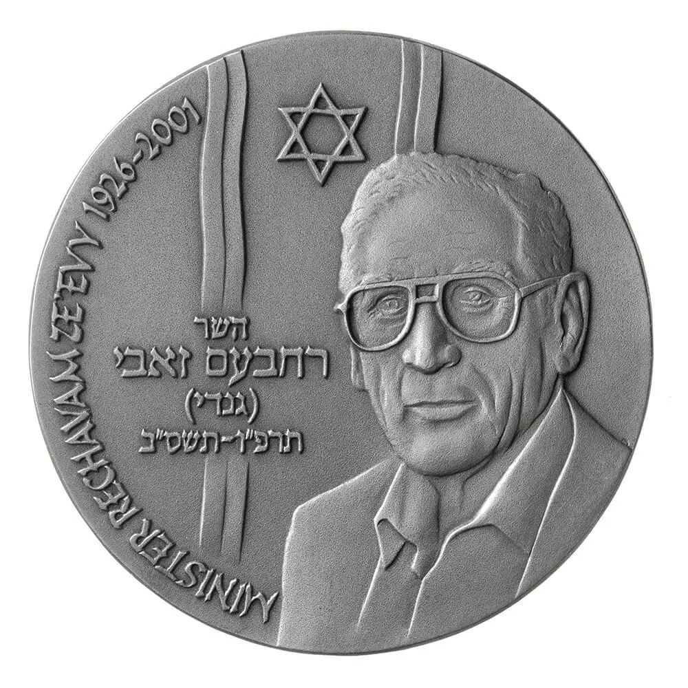 Описание: Зображення Рехавама Зееві з ізраїльським прапором і зіркою Давида на тлі; напис «МІНІСТР РЕХАВАМ ЗЕЕВІ 1926-2001» викарбувано івритом та англійською мовою ліворуч.