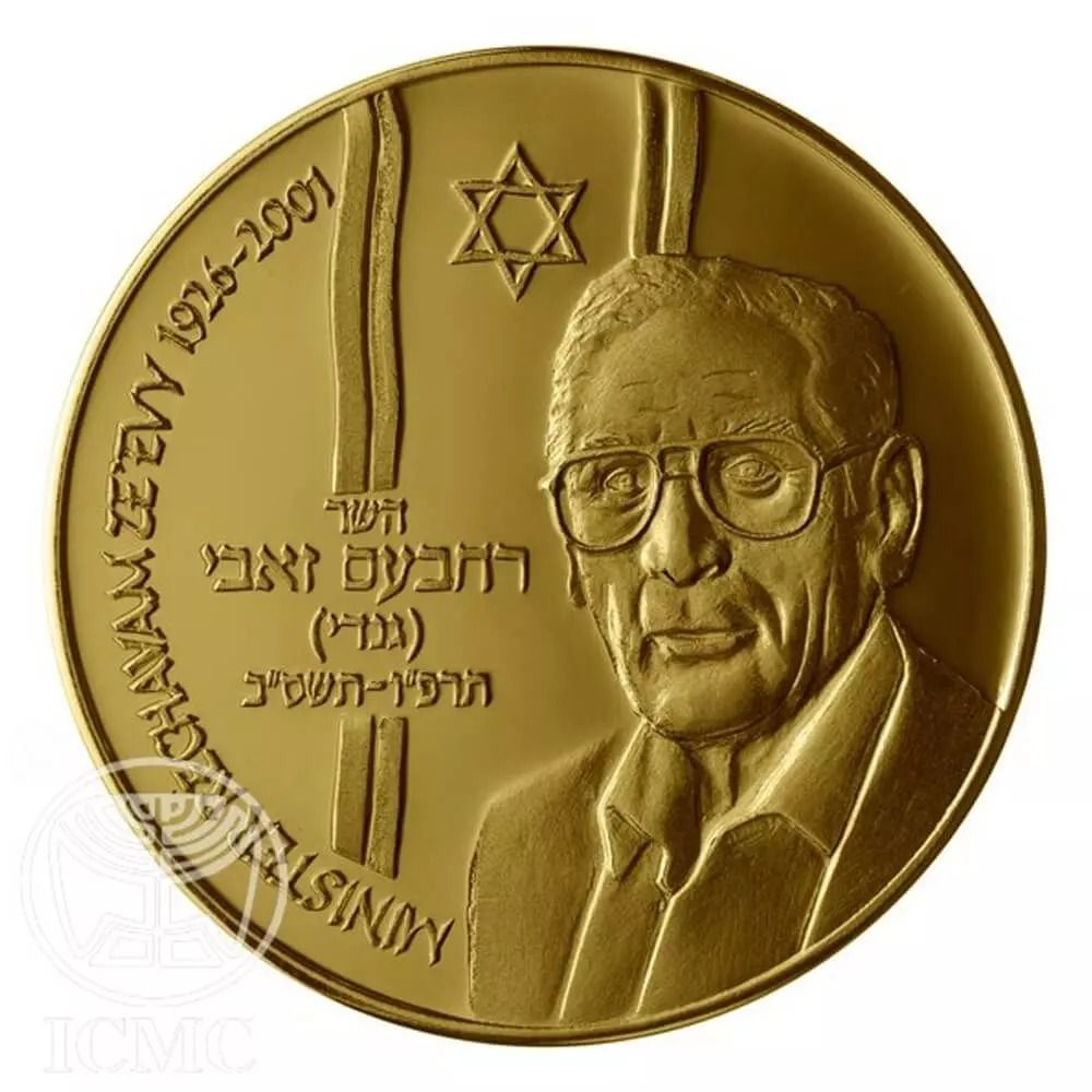 Описание: Зображення Рехавама Зееві з ізраїльським прапором і зіркою Давида на тлі; напис «МІНІСТР РЕХАВАМ ЗЕЕВІ 1926-2001» викарбувано івритом та англійською мовою ліворуч.