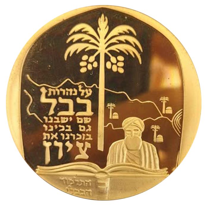 Описание: Малюнок іракського пейзажу з пальмами та річками (що символізують Тигр та Євфрат). Праворуч — зображення одного з мудреців Вавилону з відкритим перед ним Вавилонським Талмудом. Ліворуч — біблійний цитат «На берегах річок Вавилону ми сиділи і плакали, згадуючи Сіон».