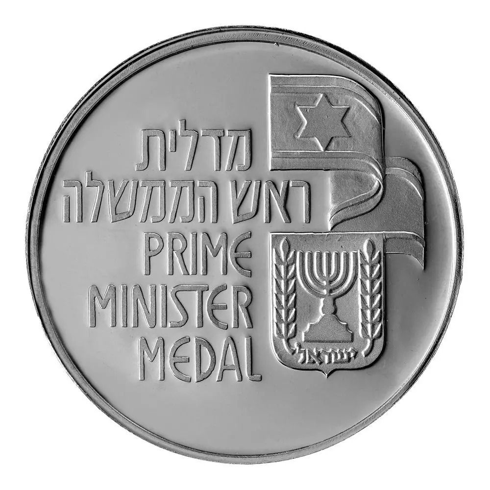 Описание: Напис «Медаль прем'єр-міністра» на івриті та англійською мовою, праворуч — державний герб Ізраїлю, над ним — прапор Ізраїлю.