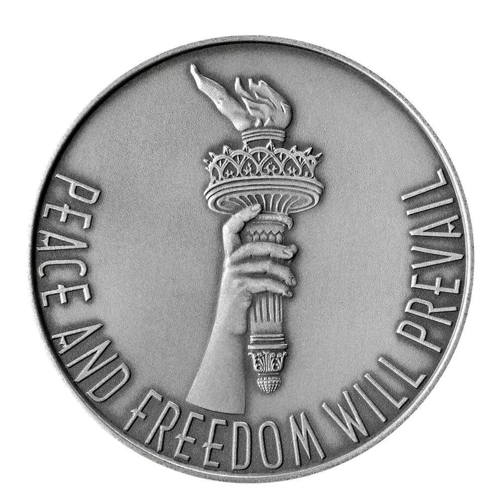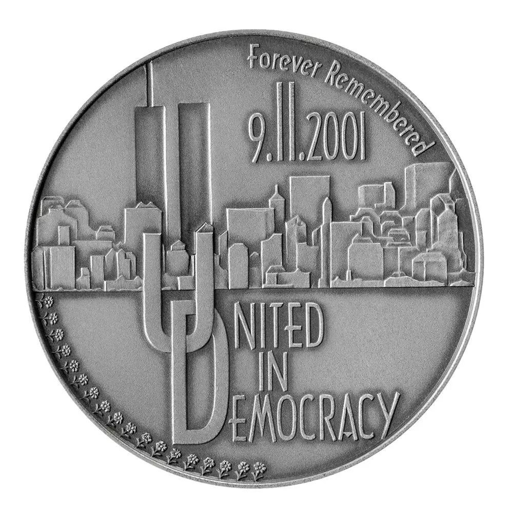 Описание: На рельєфі зображені хмарочоси Манхеттена, а відсутні вежі-близнюки викарбувані, символізуючи їх відсутність. Над горизонтом — дата 9.11.01, де «11» зображено у вигляді веж-близнюків, напис «United in Democracy» («Об'єднані в демократії») з переплетеними літерами «U» та «D». У верхньому правому куті — напис «Forever Remembered» («Назавжди в пам'яті»), у нижньому лівому куті — ряд квітів.