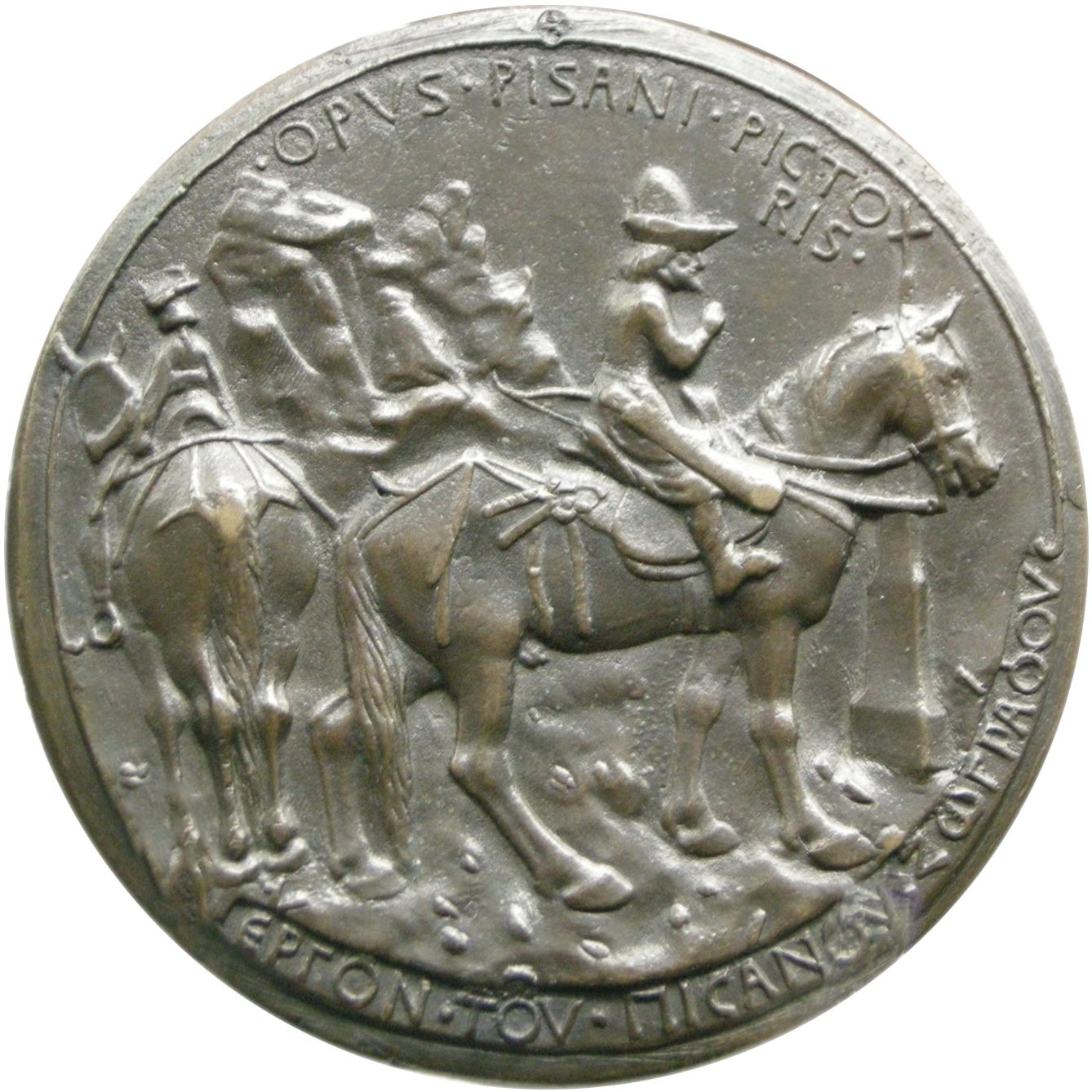 Описание: Візантійський імператор Іоанн VIII Палеолог на коні, обернений праворуч, у куполоподібному капелюсі, піднявши праву руку і тримаючи лук та колчан зі стрілами біля правого стегна. Ліворуч, ззаду, зображений сідловий зброєносець. Обидва коні мають вишукані ремені на задніх ногах. Праворуч — придорожній хрест на постаменті. На задньому плані — скелястий ландшафт.