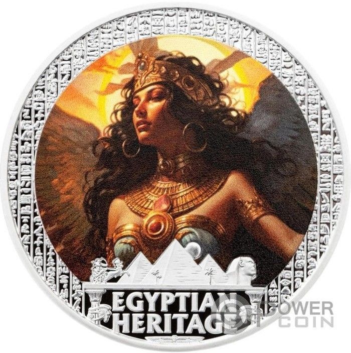 Описание: Цветное компьютерное изображение Исиды в центре, комплекса пирамид в Гизе внизу и иероглифов по краю.