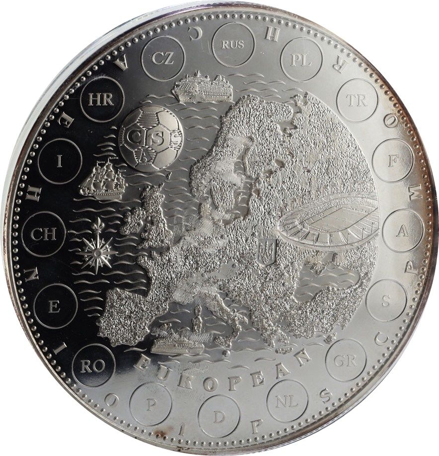 Описание: Карта Европы с футбольным стадионом, мячом, кораблями и розой ветров. По периметру указаны инициалы стран, участвующих в чемпионате.