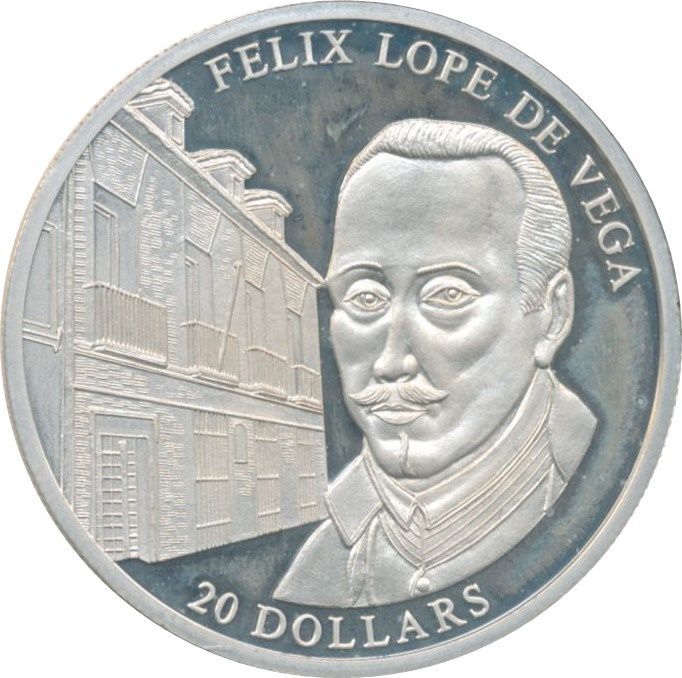 Описание: Бюст испанского драматурга, поэта и романиста Феликса Лопе де Вега, обращенный лицом к зрителю, на фоне здания.