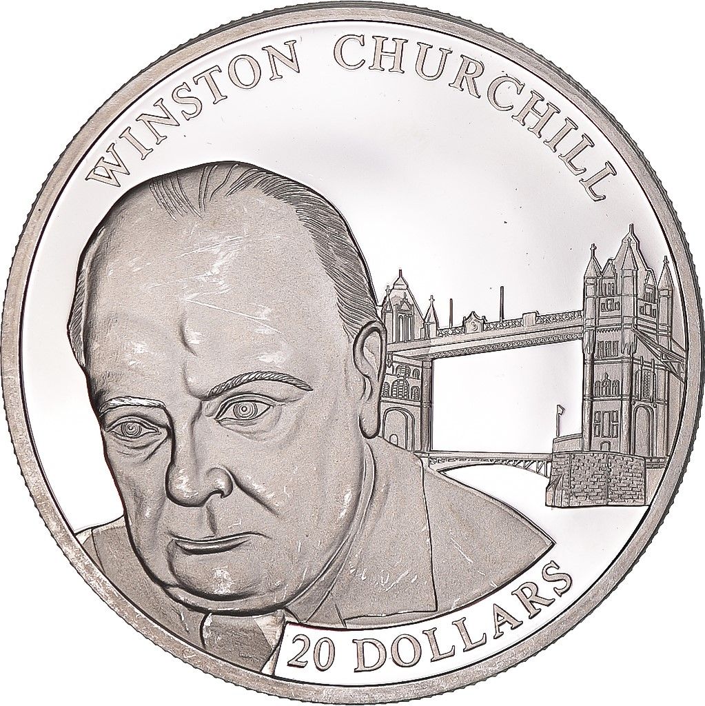 Описание: Бюст британского государственного деятеля Уинстона Черчилля, обращенный вперед, и лондонский Тауэрский мост на заднем плане.