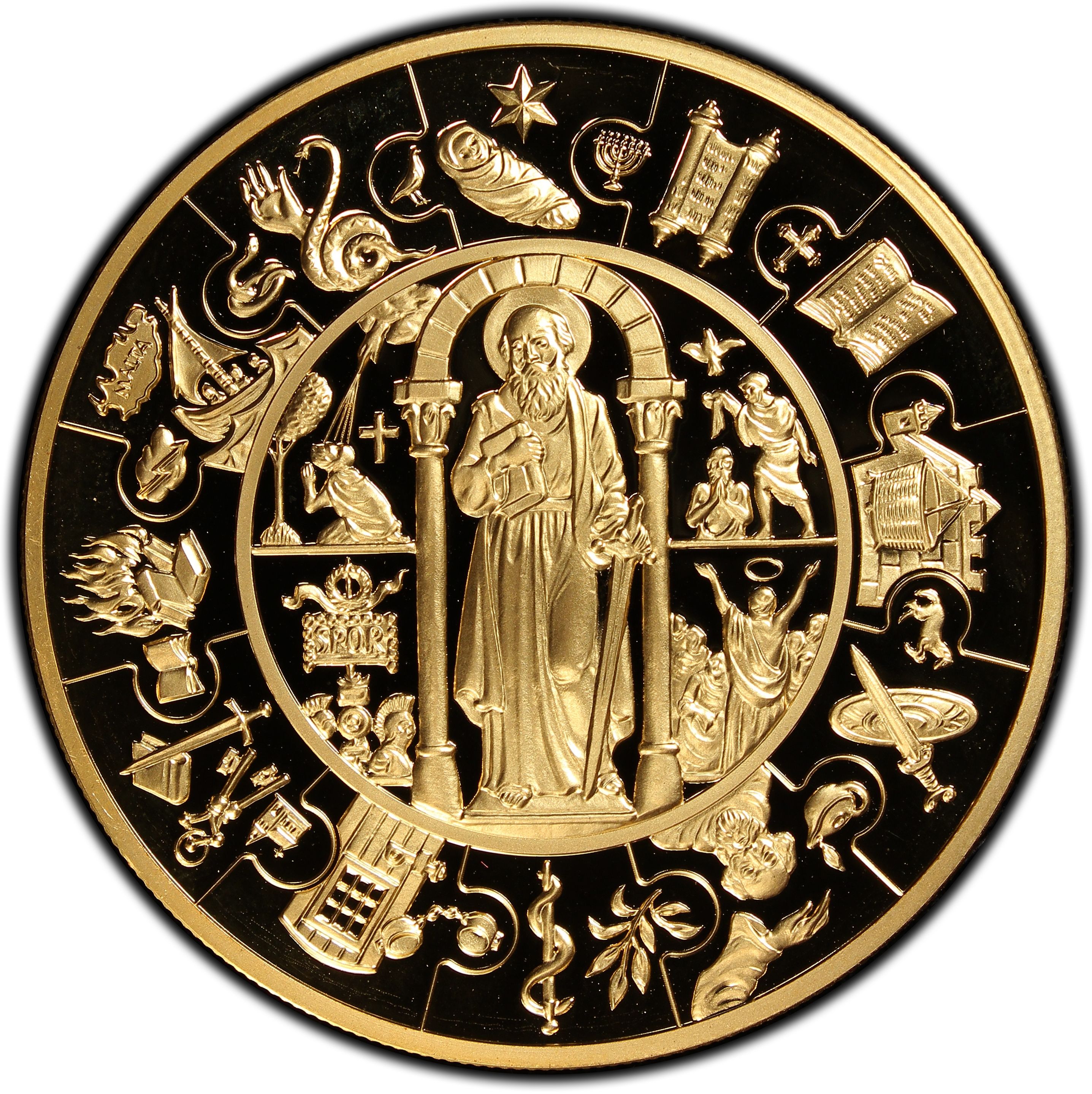 Описание: Стоящая фигура апостола Павла в полный рост, вокруг нее четыре религиозных изображения, а по внешнему периметру в виде сцепленных частей пазла — фигуры, символизирующие апостола Павла.