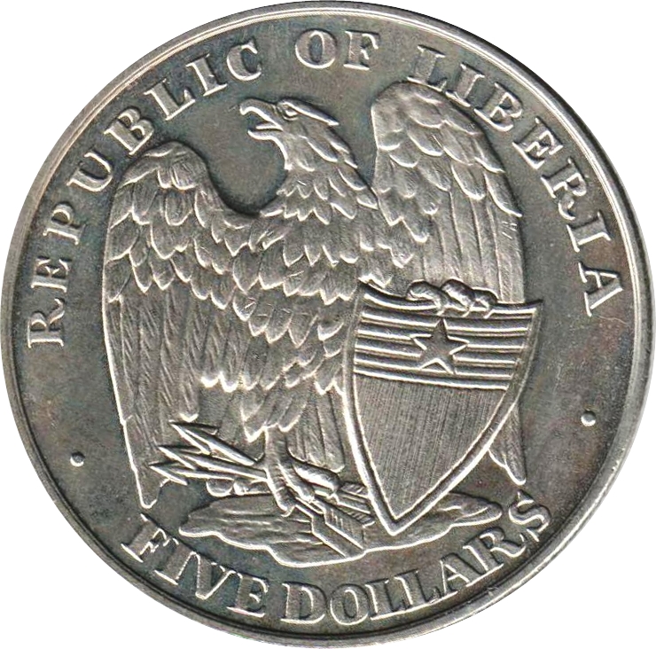 Описание: Орел ліворуч із щитом і трьома стрілами. Напис зверху: «REPUBLIC OF LIBERIA» (Республіка Ліберія). Напис знизу: «FIVE DOLLARS» (П'ять доларів). Дві крапки з боків.