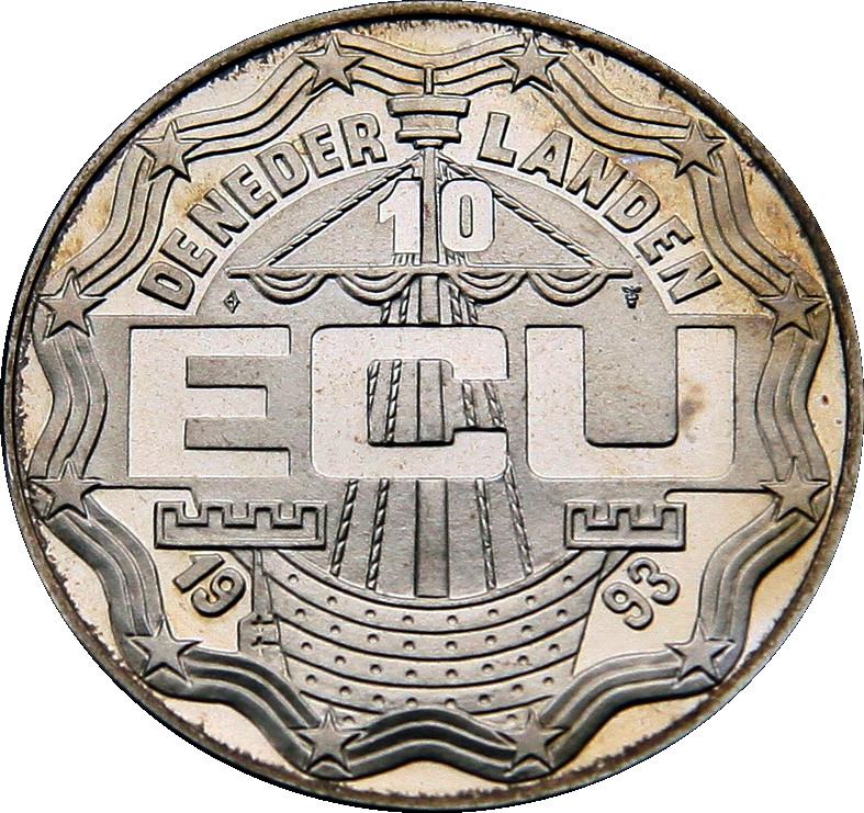 Описание: Велика літера «ECU», середньовічний вітрильник, 12 зірок у стрічковій облямівці.