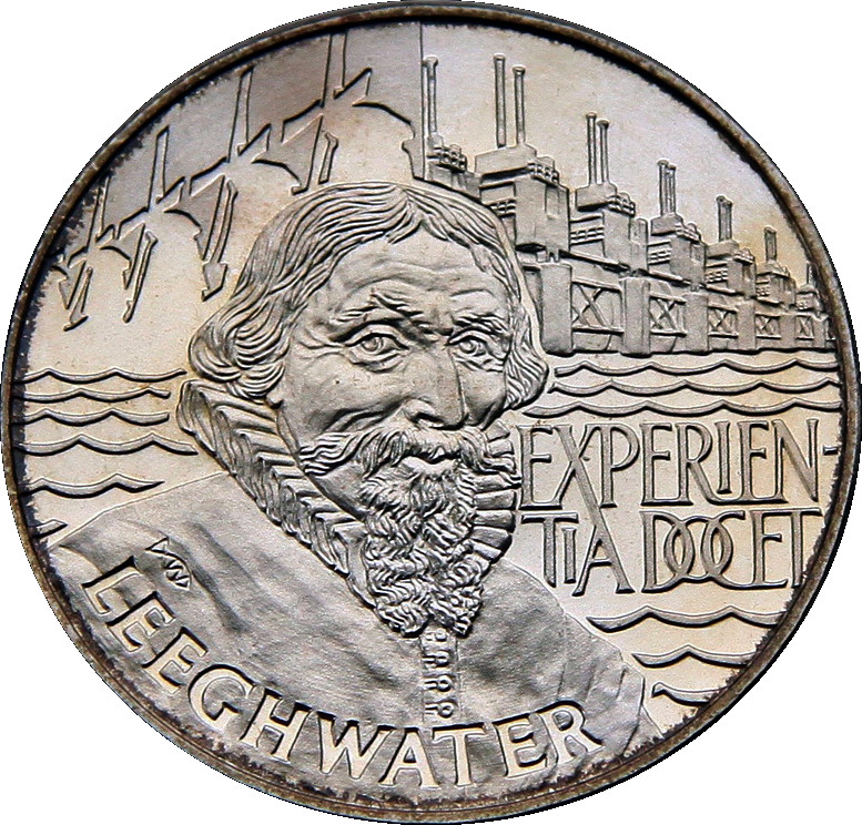 Описание: Портрет Яна А. Легватера, звернений на 1/4 праворуч, вода, вітряки та насосні станції на задньому плані.