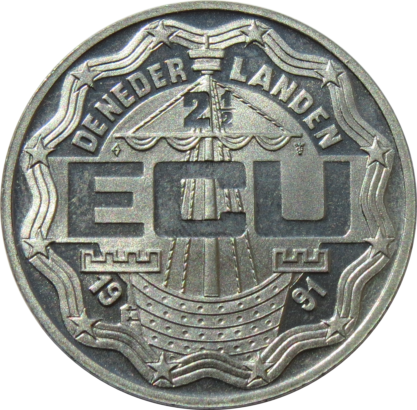 Описание: Велика «ECU», середньовічний вітрильник, 12 зірок у стрічковій облямівці. Приватний знак на носі.