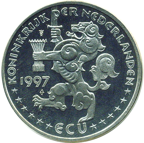 Описание: Геральдичний лев Королівства Нідерландів. Лев, що стоїть на задніх лапах, тримає меч і 7 стріл. Написи та 12 зірок по колу. Приватний знак у вигляді лука.