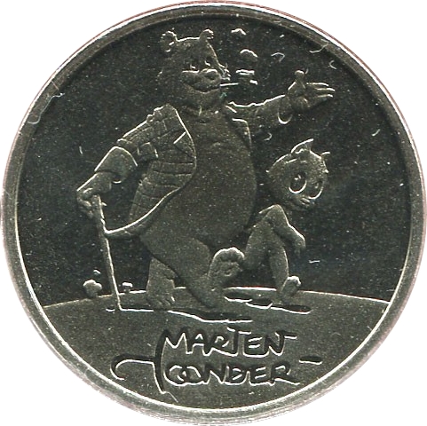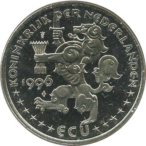 Описание: Геральдичний лев Королівства Нідерландів. Лев, що стоїть на задніх лапах, тримає меч і 7 стріл. Написи та 12 зірок по колу.